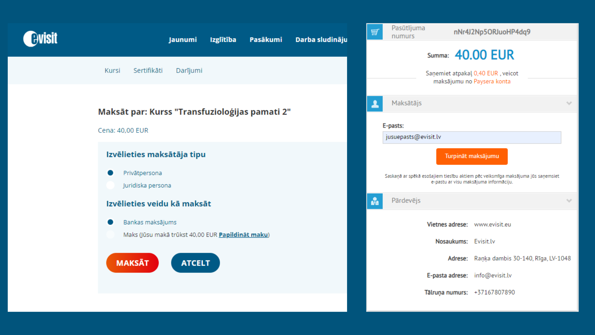 Atveriet vēlamo izglītojošo materiālu. Spiediet uz pogas Iegādāties. Ja maksājumu veicat kā privātpersona spiediet uz pogas Maksāt. Atveroties bankas (Paysera) maksājuma logam, Jums ir jāievada Jūsu e-pasts maksājumu detaļu saņemšanai un jāspiež poga Turpināt maksājumu. No saraksta izvēlieties Jūsu banku un veiciet maksājumu.