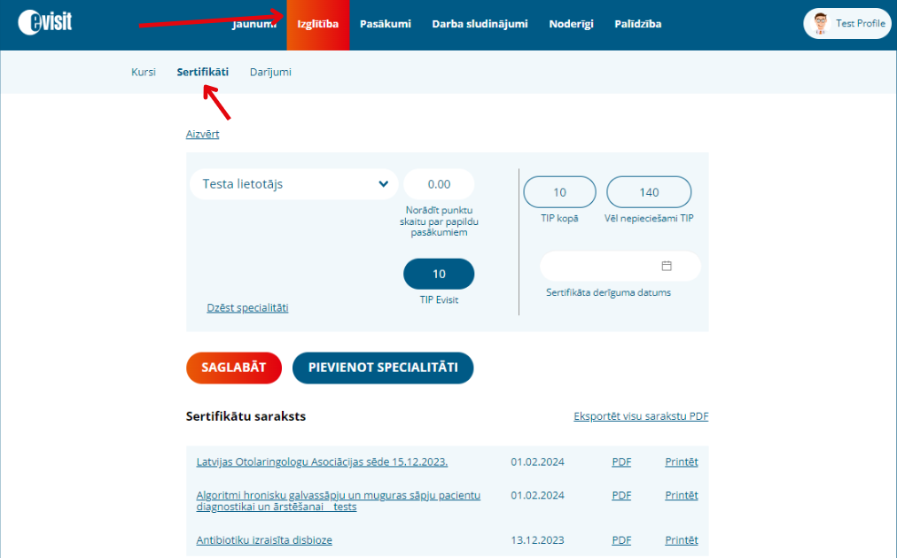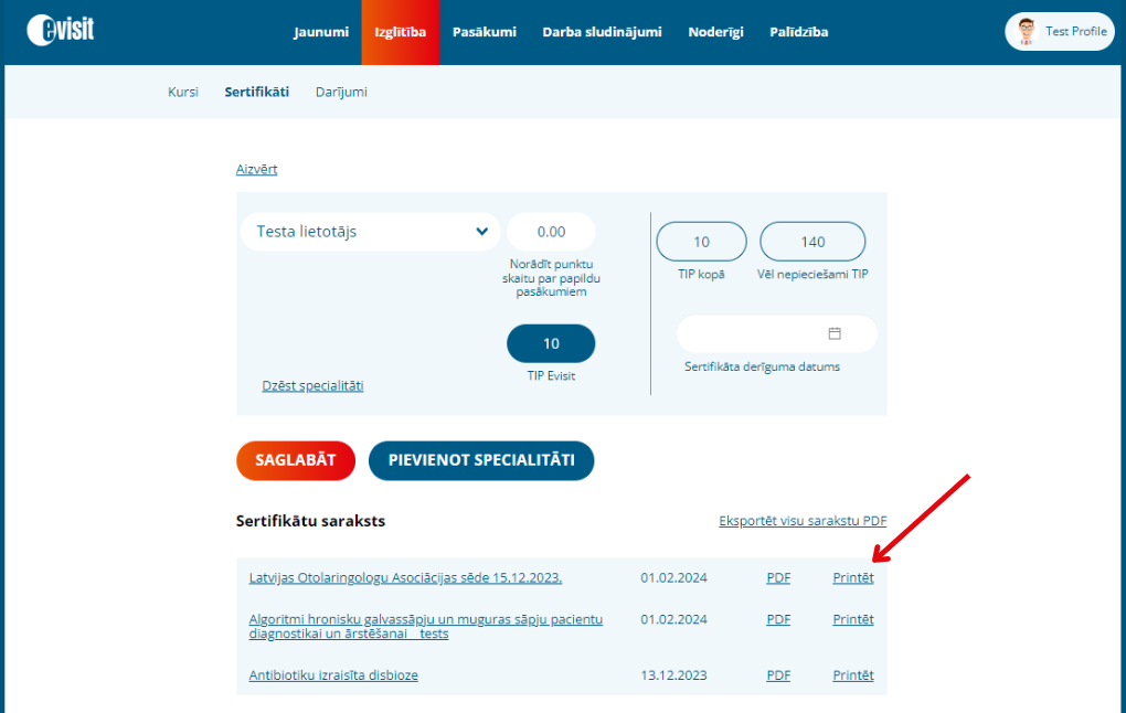 Lejupielādēt sertifikātus varat, spiežot uz pogas PDF. Lai izdrukātu, spiediet uz pogas Printēt.